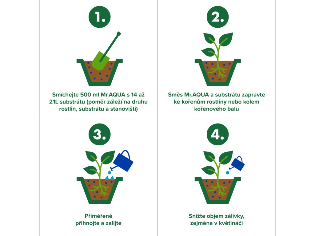 - smísení s půdou, substrátem nebo kompostem v doporučeném poměru 500 ml Mr.AQUA/14–21 L substrátu/3 roky (24-36 ml/1 litr substrátu) - poměr záleží na druhu rostlin, substrátu a stanovišti